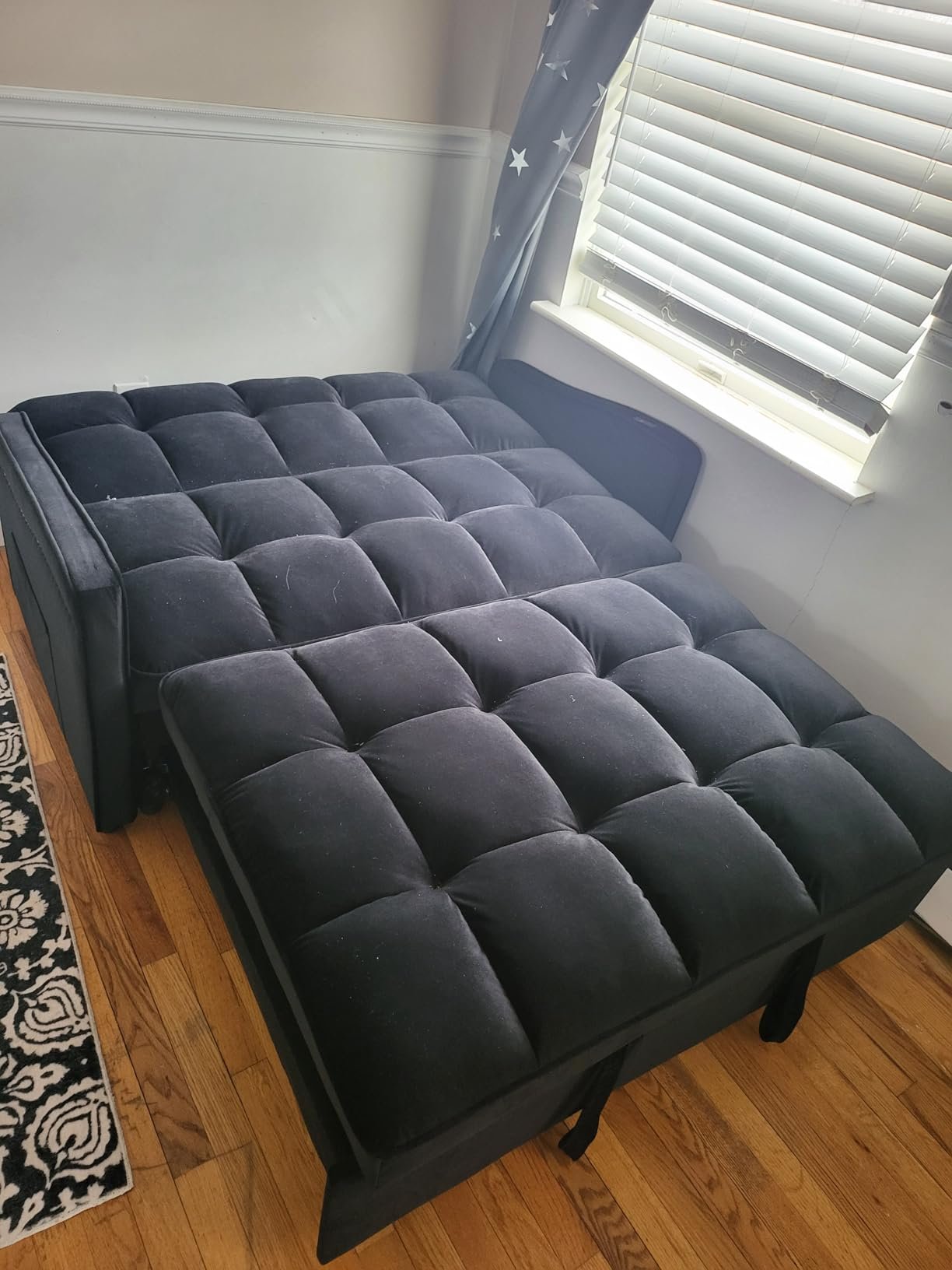 ??CONVERTIBLE SOFA BED — Pull the included handle and it slides out on its rollers to make loveseat sofa converts to sleeper bed easily, No matter what room it is, whether it is a large room or a small room, this is your best choice! The twin-sized sleeper bed can accommodate your overnight guests. ??STRONGE STRUCTURE — Crafted of sturdy wood frame, strong sinuous spring, high-density foam, soft velvet fabric,good foam-filled seats, soft 2 lumbar pillows make you feeling so comfortable to take a good rest. Maximum Weight Capacity is 500 lbs. ??3 LEVEL ADJUSTABLE BACKREST — This convertible sofa meets your various needs.So easy to make loveseat converts to bed. Nice to sitting,laying and sleeping,it can be easily converted into chaise lounge or a sleeper bed for small apartment,living room,studio,home office,etc. After finishing the day’s work, take off your shoes, lie down in the cushions of the sofa and rest your back on the elastic backrest. ??SPACE SAVING DESIGN & STORAGE