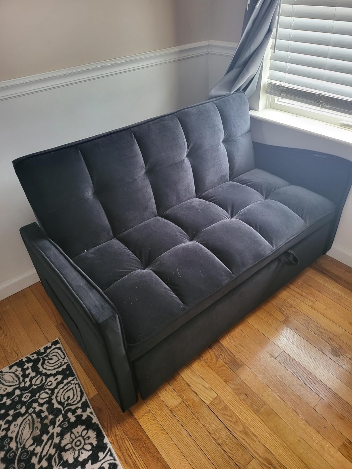 ??CONVERTIBLE SOFA BED — Pull the included handle and it slides out on its rollers to make loveseat sofa converts to sleeper bed easily, No matter what room it is, whether it is a large room or a small room, this is your best choice! The twin-sized sleeper bed can accommodate your overnight guests. ??STRONGE STRUCTURE — Crafted of sturdy wood frame, strong sinuous spring, high-density foam, soft velvet fabric,good foam-filled seats, soft 2 lumbar pillows make you feeling so comfortable to take a good rest. Maximum Weight Capacity is 500 lbs. ??3 LEVEL ADJUSTABLE BACKREST — This convertible sofa meets your various needs.So easy to make loveseat converts to bed. Nice to sitting,laying and sleeping,it can be easily converted into chaise lounge or a sleeper bed for small apartment,living room,studio,home office,etc. After finishing the day’s work, take off your shoes, lie down in the cushions of the sofa and rest your back on the elastic backrest. ??SPACE SAVING DESIGN & STORAGE